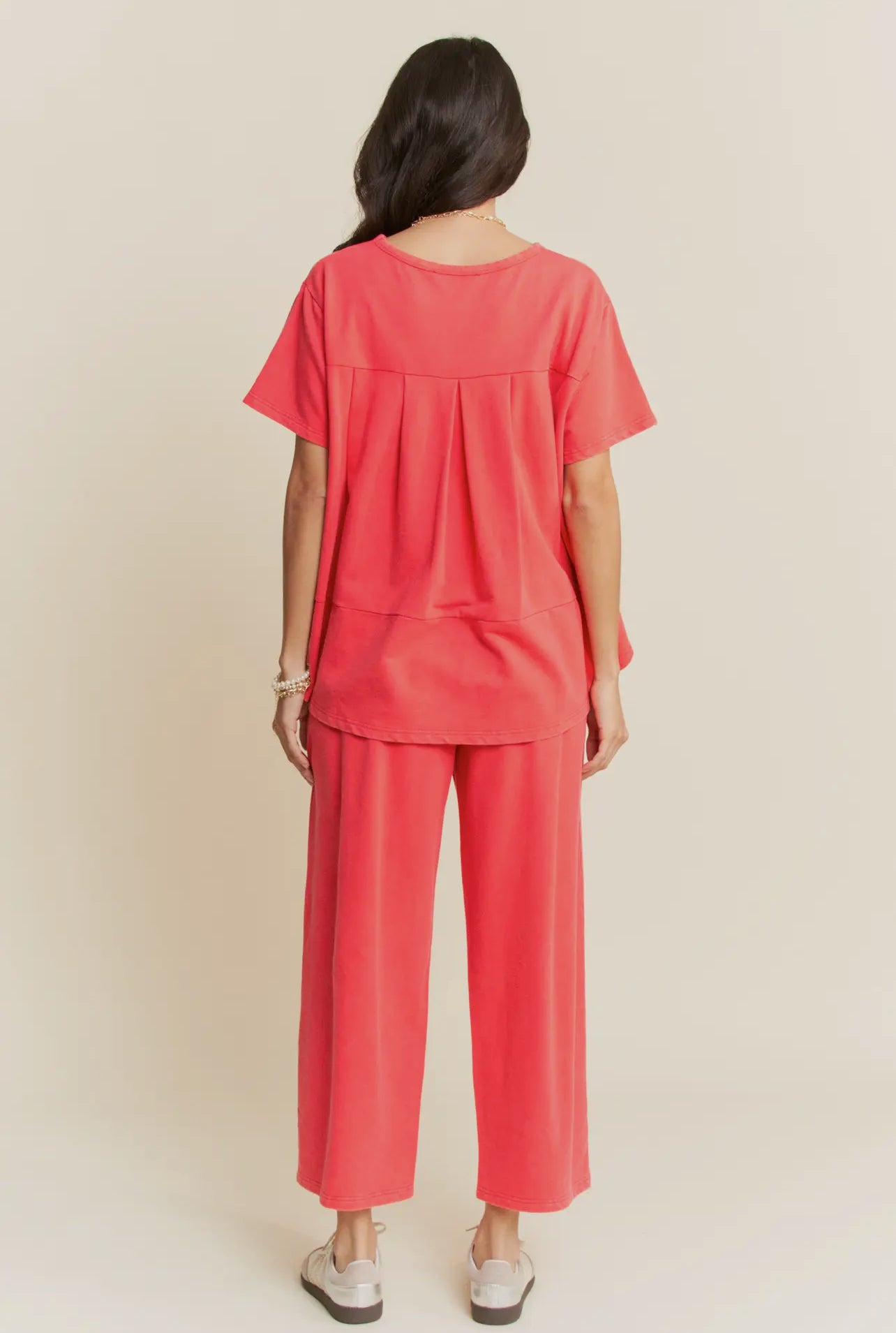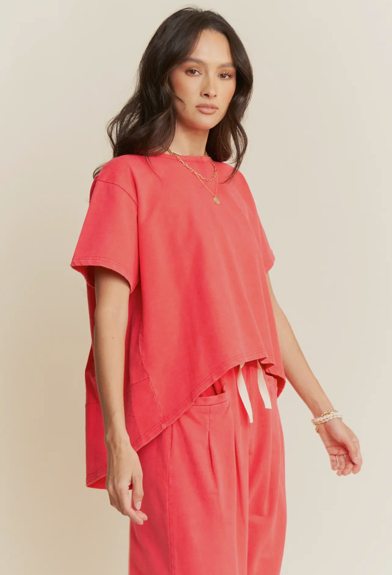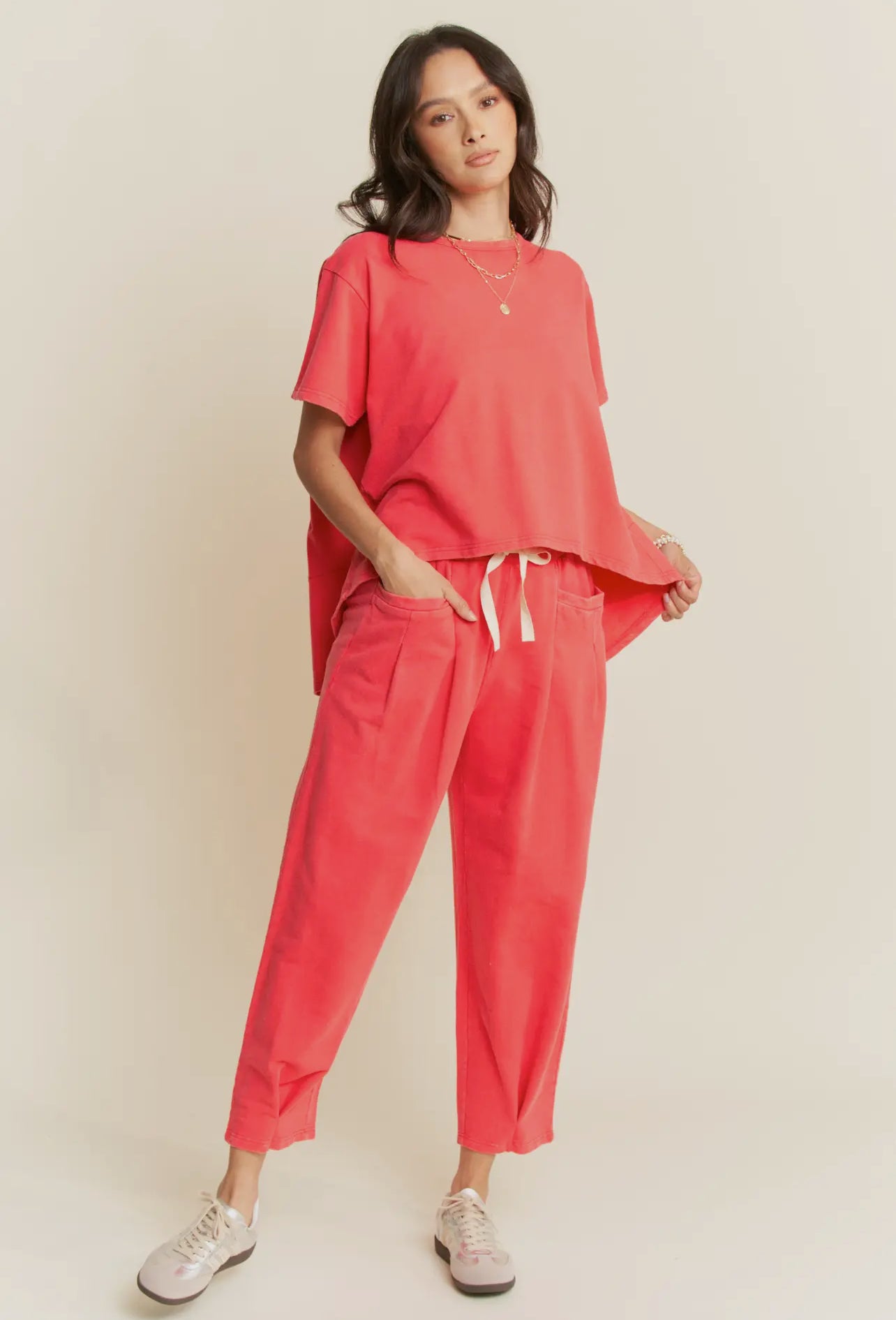 This two-piece cotton set features a hi-low relaxed tee with subtle back pleats and wide-leg drawstring pants with pockets. An essential for elevated lounge styling, it balances comfort with polish-perfect for curated casual wear that transitions seamlessly from home to street.