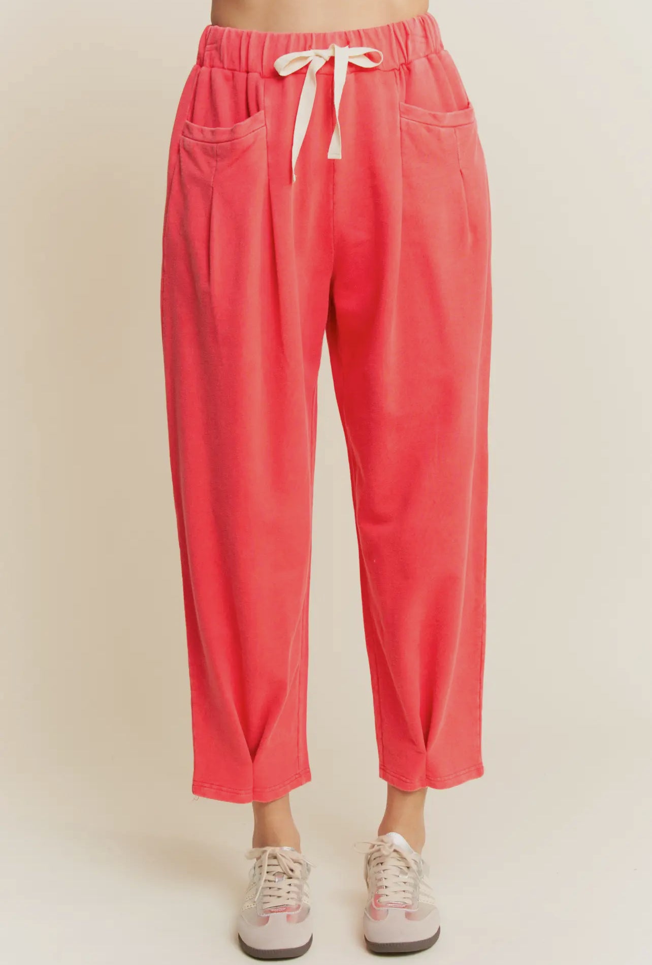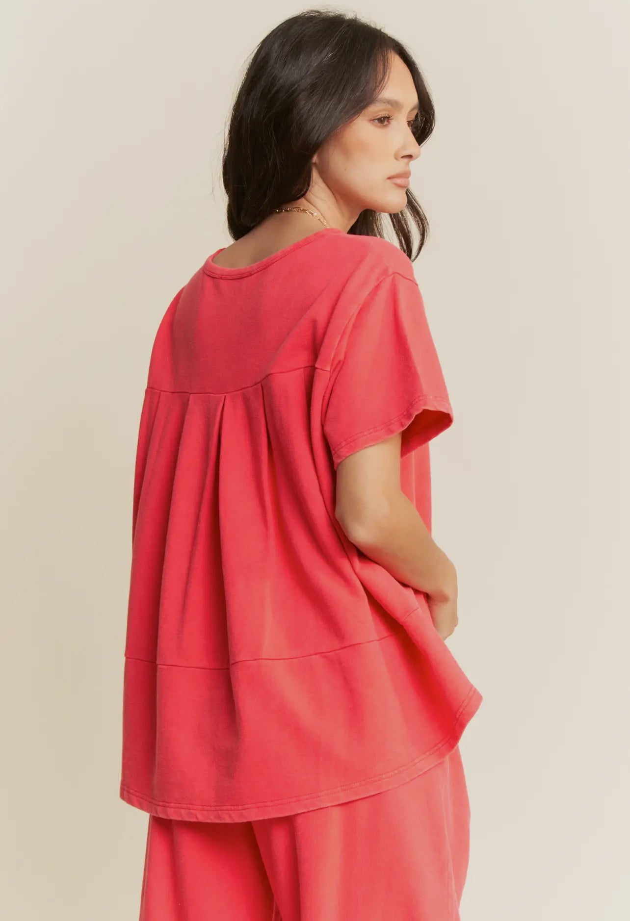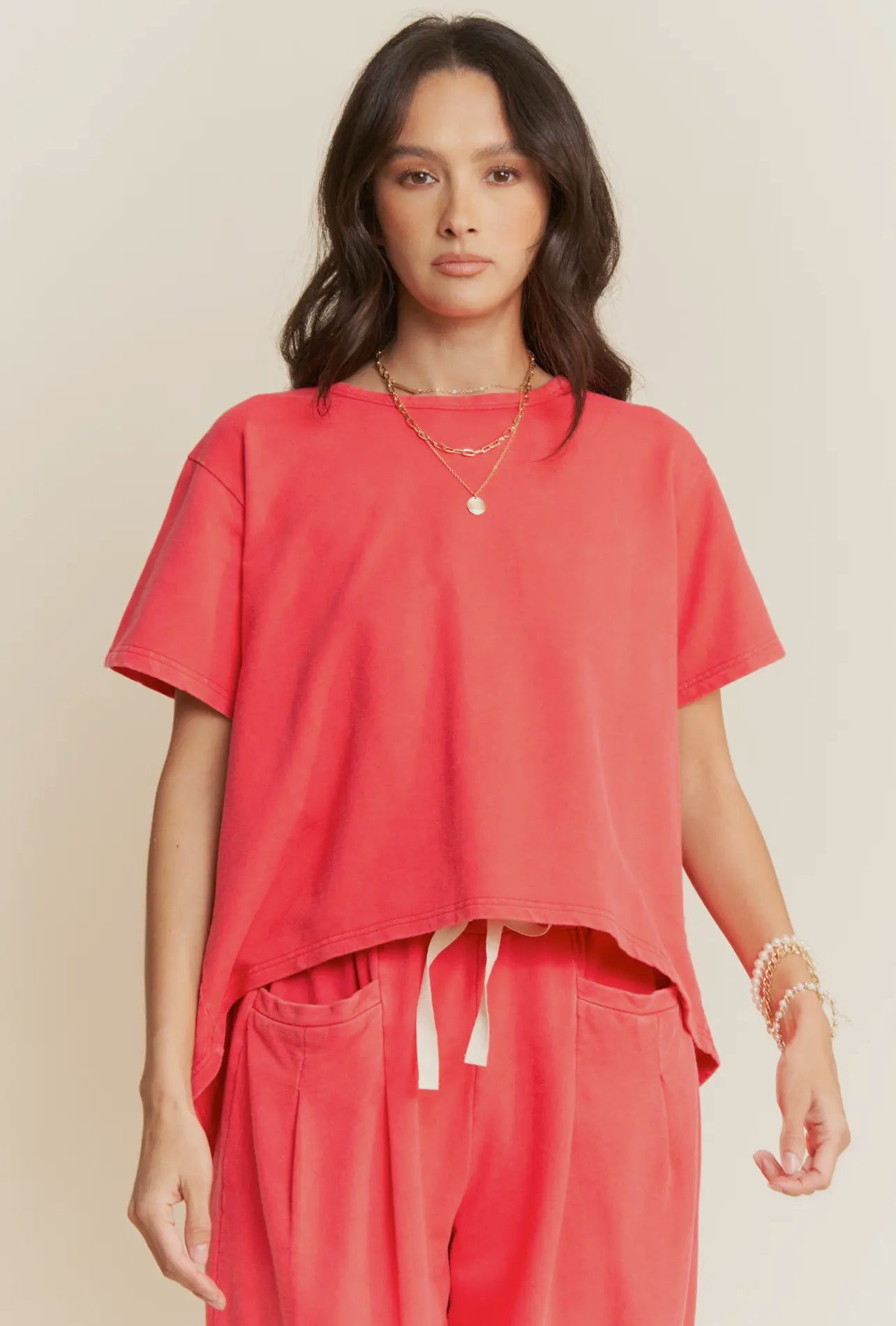 This two-piece cotton set features a hi-low relaxed tee with subtle back pleats and wide-leg drawstring pants with pockets. An essential for elevated lounge styling, it balances comfort with polish-perfect for curated casual wear that transitions seamlessly from home to street.